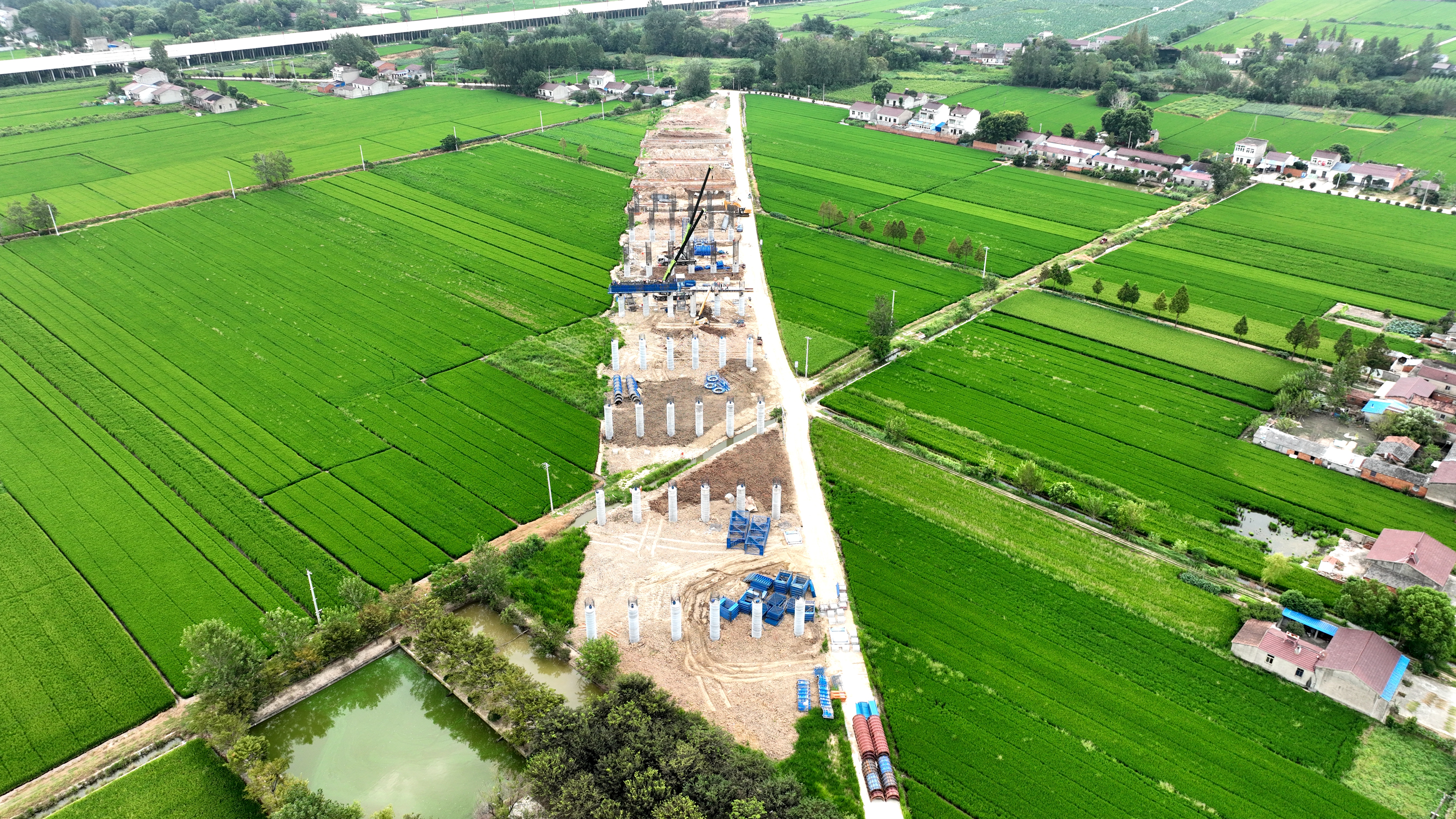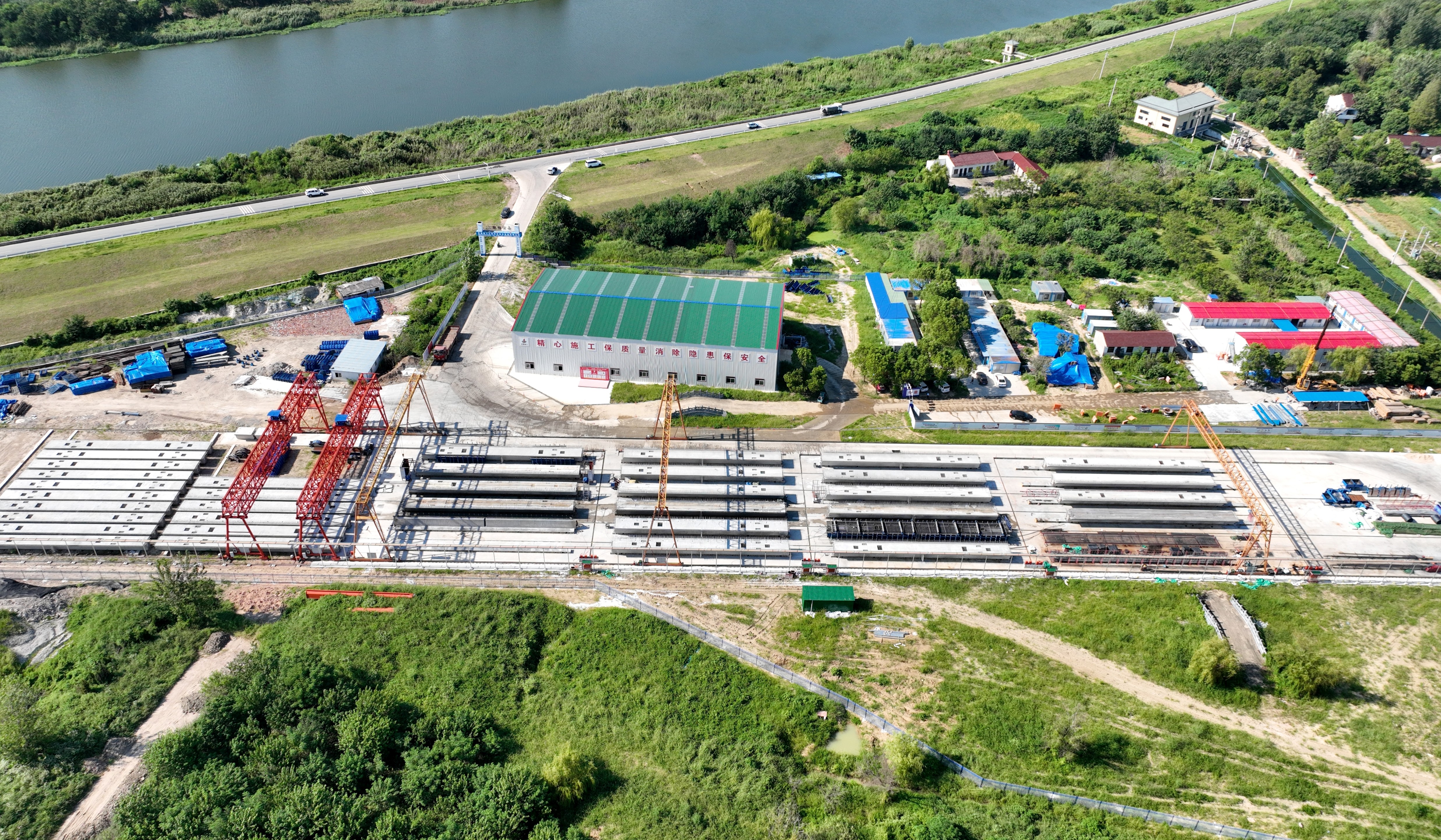 預制梁場作為橋梁架設(shè)的“后方糧倉”,同樣按下“加速鍵”。項目規(guī)劃的2處標準化預制梁場,承擔著全線2130片箱梁的預制任務,其建設(shè)進度與制梁效率直接關(guān)系橋梁架設(shè)的連續(xù)性。其中,1#梁場(占地40畝)擔負杭埠河特大橋南岸箱梁預制工作,目前該梁場生產(chǎn)線進入批量生產(chǎn)階段,已完成42片箱梁澆筑;規(guī)模更大的2#梁場(占地70畝)擔負杭埠河特大橋北岸、跨三河支線特大橋及東一支渠大橋共1140片箱梁的預制工作,目前整體建設(shè)進入收尾階段,預計近期可投入使用,屆時兩處梁場將形成“南北呼應、同步制梁”的產(chǎn)能格局。