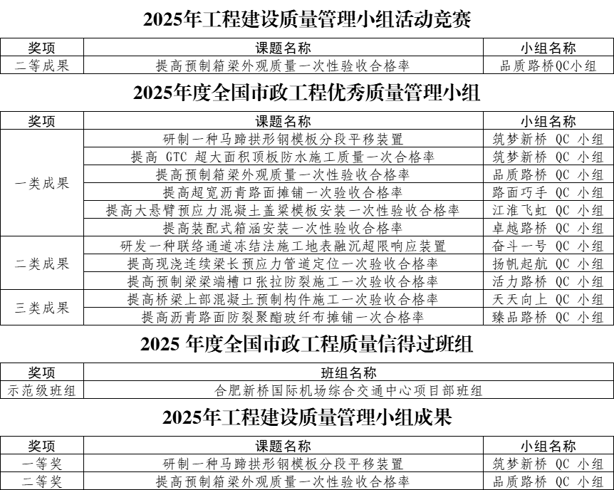 近日,中國市政工程協(xié)會、中國建筑業(yè)協(xié)會、中國施工企業(yè)管理協(xié)會先后公布2025年度質(zhì)量管理小組及班組活動成果大賽評選結(jié)果,公司共斬獲15項(xiàng)國家級獎項(xiàng)。