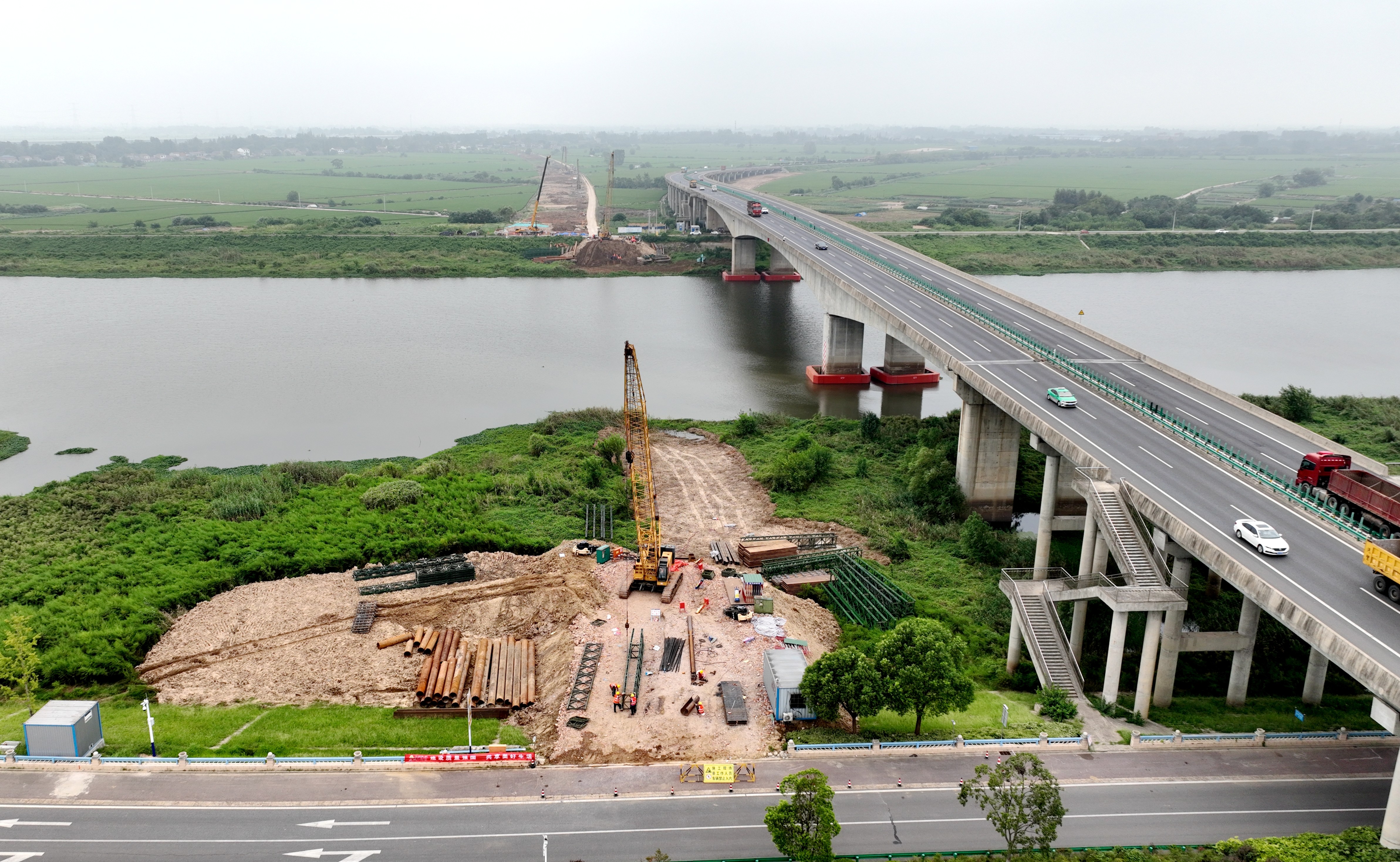 作為全線重難點及控制性工程,杭埠河特大橋全長約5.63公里,主橋采用85+150+85米矮塔斜拉橋結(jié)構(gòu),橫跨杭埠河核心河道,其施工進度直接關(guān)系項目整體工期。項目結(jié)合現(xiàn)場地質(zhì)條件與施工環(huán)境,多次組織行業(yè)專家召開技術(shù)研討會,創(chuàng)新采用“南北兩岸同步推進、流水作業(yè)銜接”模式提速攻堅,保障主墩、過渡墩施工的順利推進。反復(fù)優(yōu)化專項施工方案,全程嚴格把控工藝標準與安全管控細節(jié),確保東一支渠大橋首根樁基的順利澆筑。