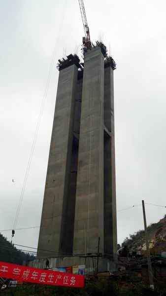 巖子腳特大橋?yàn)檫B續(xù)性剛構(gòu)橋,兩主墩之間跨度160米。主橋左、右幅均為混凝土連續(xù)箱梁,是水盤線幾個(gè)重點(diǎn)控制工程之一,也是影響我項(xiàng)目工期的關(guān)鍵性工程。該橋主體橋墩都有4根墩柱,高度均超過(guò)58米,此次完成封頂?shù)闹鳂?SPAN lang=EN-US>4號(hào)墩是迄今為止我公司施工過(guò)的最高橋墩。